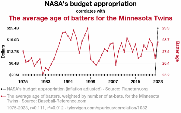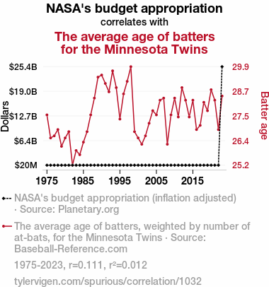 - The spurious research paper: Out of This World Hitters: Exploring the Cosmic Connection Between NASA's Budget Appropriation and the Average Age of Batters for the Minnesota Twins