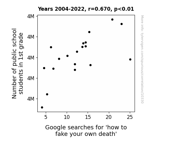 This means 44.9% of the change in the one variable (i.e., Google searches for 'how to fake your own death') is predictable based on the change in the other (i.e., Number of public school students in 1st grade) over the 19 years from 2004 through 2022.