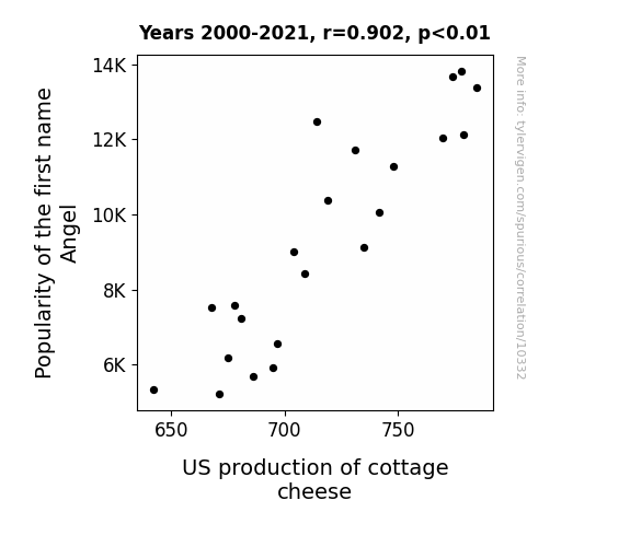 This means 81.3% of the change in the one variable (i.e., US production of cottage cheese) is predictable based on the change in the other (i.e., Popularity of the first name Angel) over the 22 years from 2000 through 2021.