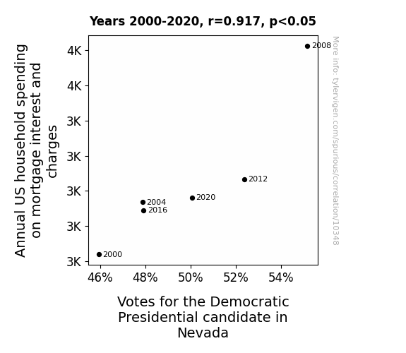 This means 84.1% of the change in the one variable (i.e., Votes for the Democratic Presidential candidate in Nevada) is predictable based on the change in the other (i.e., Annual US household spending on mortgage interest and charges) over the 6 years from 2000 through 2020.