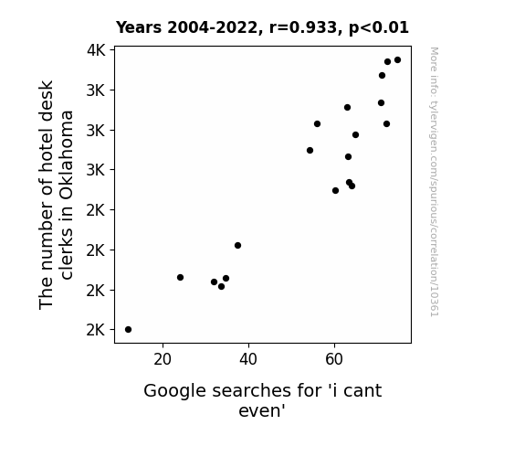This means 87.1% of the change in the one variable (i.e., Google searches for 'i cant even') is predictable based on the change in the other (i.e., The number of hotel desk clerks in Oklahoma) over the 19 years from 2004 through 2022.