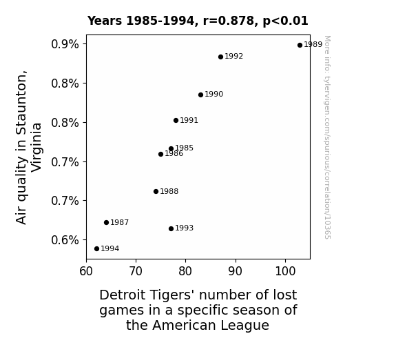 This means 77.1% of the change in the one variable (i.e., Detroit Tigers' number of lost games in a specific season of the American League) is predictable based on the change in the other (i.e., Air quality in Staunton, Virginia) over the 10 years from 1985 through 1994.