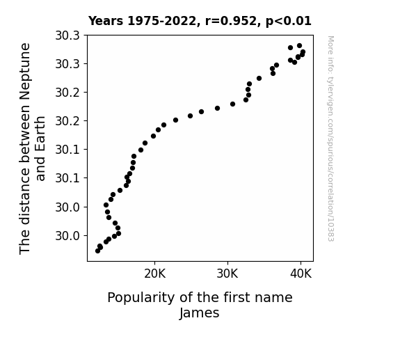 This means 90.6% of the change in the one variable (i.e., Popularity of the first name James) is predictable based on the change in the other (i.e., The distance between Neptune and Earth) over the 48 years from 1975 through 2022.