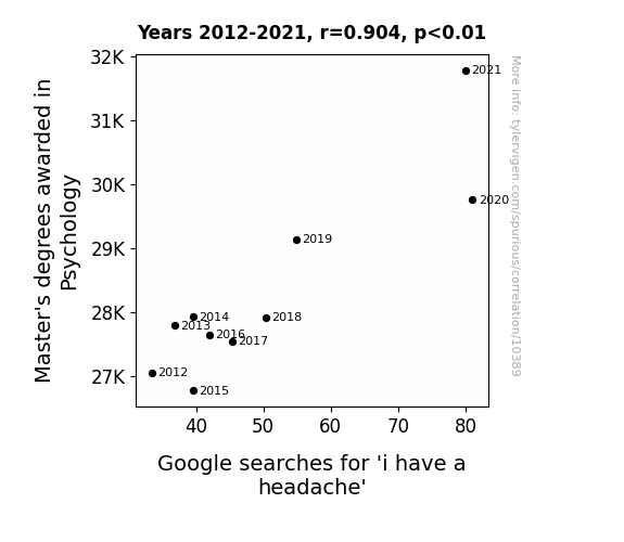 This means 81.7% of the change in the one variable (i.e., Google searches for 'i have a headache') is predictable based on the change in the other (i.e., Master's degrees awarded in Psychology) over the 10 years from 2012 through 2021.