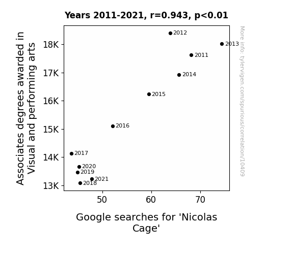This means 88.9% of the change in the one variable (i.e., Google searches for 'Nicolas Cage') is predictable based on the change in the other (i.e., Associates degrees awarded in Visual and performing arts) over the 11 years from 2011 through 2021.