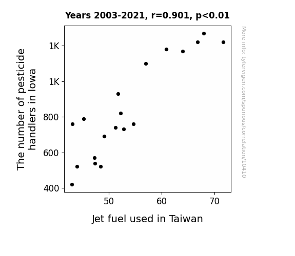 This means 81.2% of the change in the one variable (i.e., Jet fuel used in Taiwan) is predictable based on the change in the other (i.e., The number of pesticide handlers in Iowa) over the 19 years from 2003 through 2021.