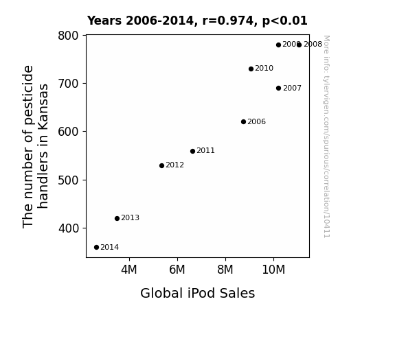 This means 94.9% of the change in the one variable (i.e., Global iPod Sales) is predictable based on the change in the other (i.e., The number of pesticide handlers in Kansas) over the 9 years from 2006 through 2014.