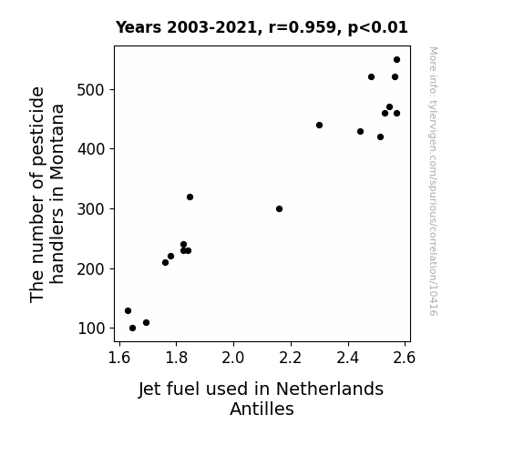 This means 91.9% of the change in the one variable (i.e., Jet fuel used in Netherlands Antilles) is predictable based on the change in the other (i.e., The number of pesticide handlers in Montana) over the 19 years from 2003 through 2021.