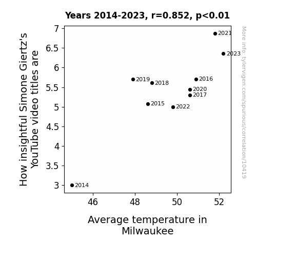 This means 72.5% of the change in the one variable (i.e., Average temperature in Milwaukee) is predictable based on the change in the other (i.e., How insightful Simone Giertz's YouTube video titles are) over the 10 years from 2014 through 2023.