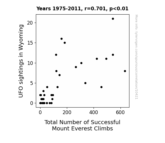 A linear line chart with years as the X-axis and two variables on the Y-axis. The first variable is UFO sightings in Wyoming and the second variable is Total Number of Successful Mount Everest Climbs.  The chart goes from 1975 to 2011, and the two variables track closely in value over that time. Small Image