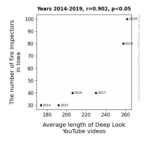 This means 81.3% of the change in the one variable (i.e., Average length of Deep Look YouTube videos) is predictable based on the change in the other (i.e., The number of fire inspectors in Iowa) over the 6 years from 2014 through 2019.