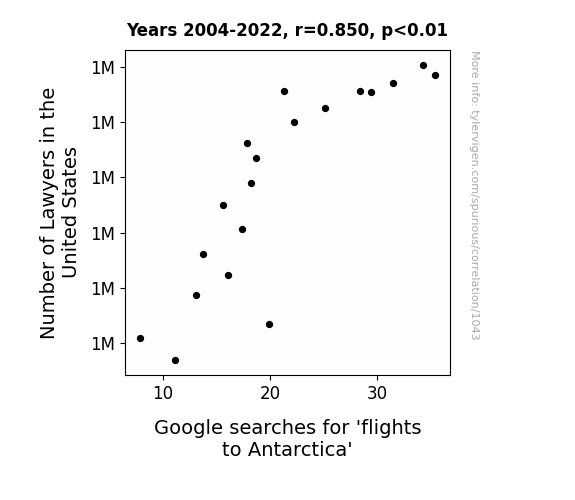 This means 72.3% of the change in the one variable (i.e., Google searches for 'flights to Antarctica') is predictable based on the change in the other (i.e., Number of Lawyers in the United States) over the 19 years from 2004 through 2022.