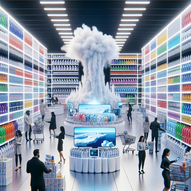 Prompt: Prompt: Generate an image that visually portrays a futuristic scene within a bustling store aisle filled with laundry and cleaning supplies. The shelves are stacked with various bottles and packages of detergents, fabric softeners, and cleaning agents. More people are shown purchasing these products, while a cloud of emissions rises from them, symbolizing their environmental impact. Additionally, people are depicted gathering around a computer or smartphone, with images of Antarctica displayed on the screen and searches for flights to Antarctica being typed into a search engine. The ambiance is modern and sleek, showcasing a blend of consumerism and the urge for environmental consciousness. The depiction should include only scenes, people, and objects, it should not include text or speech bubbles.