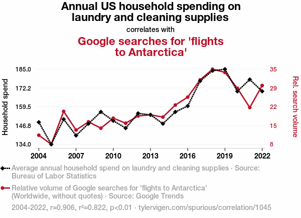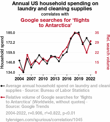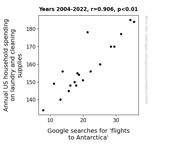 - The spurious research paper: The Dirty Laundry of Travel Aspirations: Exploring the Relationship between US Household Spending on Cleaning Supplies and Google Searches for 'Flights to Antarctica'