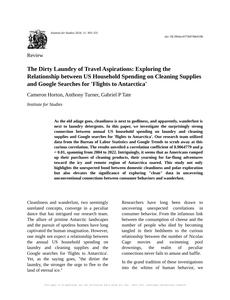 User prompt: Please provide potential search keywords for a paper titled The Dirty Laundry of Travel Aspirations: Exploring the Relationship between US Household Spending on Cleaning Supplies and Google Searches for 'Flights to Antarctica' with an abstract of As the old adage goes, cleanliness is next to godliness, and apparently, wanderlust is next to laundry detergents. In this paper, we investigate the surprisingly strong connection between annual US household spending on laundry and cleaning supplies and Google searches for 'flights to Antarctica'. Our research team utilized data from the Bureau of Labor Statistics and Google Trends to scrub away at this curious correlation. The results unveiled a correlation coefficient of 0.9064779 and p < 0.01, spanning from 2004 to 2022. Intriguingly, it seems that as Americans ramped up their purchases of cleaning products, their yearning for far-flung adventures toward the icy and remote region of Antarctica soared. This study not only highlights the unexpected bond between domestic cleanliness and polar exploration but also elevates the significance of exploring "clean" data in uncovering unconventional connections between consumer behaviors and wanderlust.