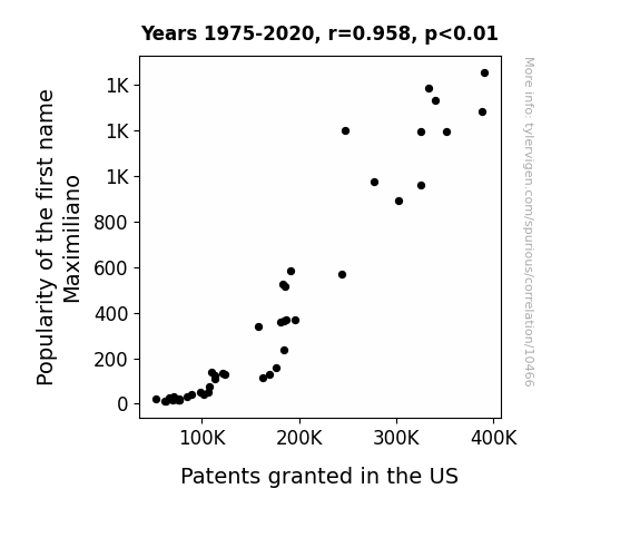 This means 91.8% of the change in the one variable (i.e., Patents granted in the US) is predictable based on the change in the other (i.e., Popularity of the first name Maximiliano) over the 46 years from 1975 through 2020.