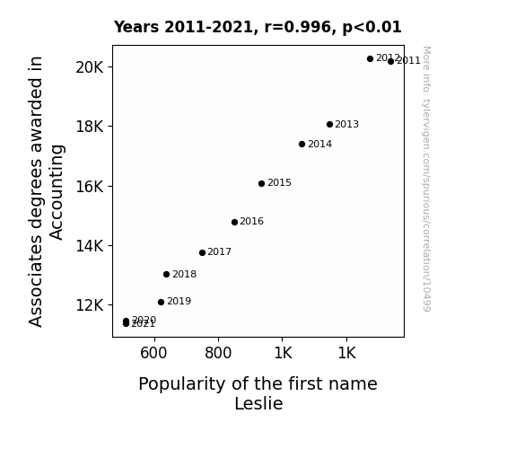 This means 99.3% of the change in the one variable (i.e., Popularity of the first name Leslie) is predictable based on the change in the other (i.e., Associates degrees awarded in Accounting) over the 11 years from 2011 through 2021.