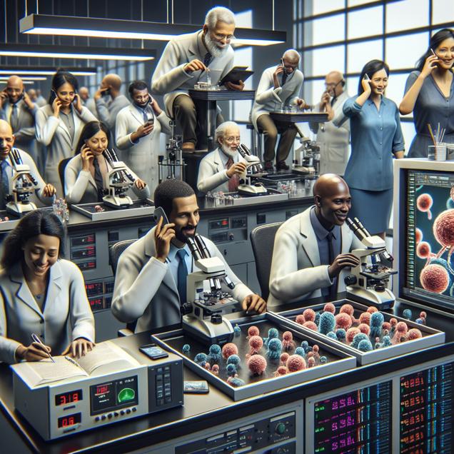 Prompt: [Hyper-realistic] In a laboratory in Maryland, a group of biological technicians work diligently under powerful microscopes, carefully observing and analyzing cellular communication at a microscopic level. The technicians are shown manipulating intricate cellular structures with precise instruments, ensuring smooth and efficient interactions between them. Meanwhile, the signal strength meter on the Sprint network equipment is depicted steadily rising, indicating improved network efficiency. Outside the laboratory, customers are depicted happily talking on their phones without experiencing any dropped calls. They are shown smiling and expressing satisfaction with their improved service. The depiction should include only scenes, people, and objects, it should not include text or speech bubbles.