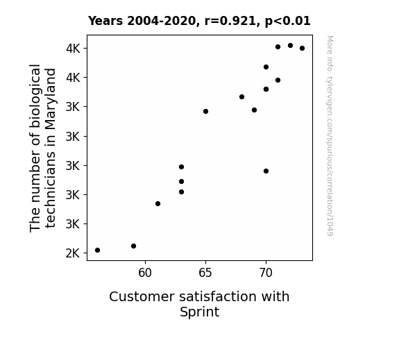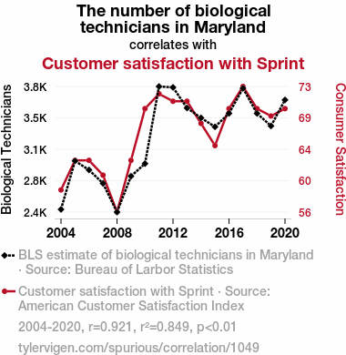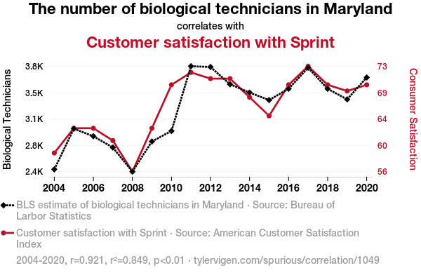 biological technicians Maryland, customer satisfaction Sprint, statistical analysis correlation, labor force biological sciences, telecommunication landscape, Bureau of Labor Statistics, American Customer Satisfaction Index, correlation coefficient, statistical serendipity