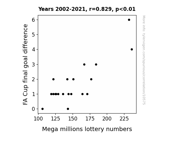 This means 68.8% of the change in the one variable (i.e., Mega millions lottery numbers) is predictable based on the change in the other (i.e., FA Cup final goal difference) over the 20 years from 2002 through 2021.