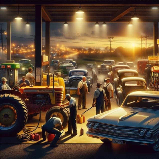 User prompt: Please describe a visual scene that depicts the following situation. Keep the description simple. Rise in Petroleum Consumption in Azerbaijan Linked to Surge in Alabama's Farm Equipment Mechanics - Experts Attribute Increase to Trans-Continental Mechanic Migration Due to Irresistible Scent of Gasoline.