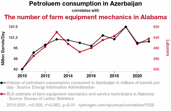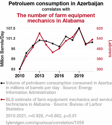 This means 86.2% of the change in the one variable (i.e., The number of farm equipment mechanics in Alabama) is predictable based on the change in the other (i.e., Petroluem consumption in Azerbaijan) over the 12 years from 2010 through 2021.