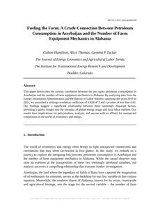 User prompt: Please provide potential search keywords for a paper titled Fueling the Farm: A Crude Connection Between Petroleum Consumption in Azerbaijan and the Number of Farm Equipment Mechanics in Alabama with an abstract of This paper delves into the curious correlation between the per capita petroleum consumption in Azerbaijan and the number of farm equipment mechanics in Alabama. By analyzing data from the Energy Information Administration and the Bureau of Labor Statistics spanning the years 2010 to 2021, we unearthed a striking correlation coefficient of 0.9283473 and a p-value of less than 0.01. Our findings suggest a significant relationship between these seemingly disparate factors, providing a quirky insight into the interplay of global energy usage and local labor markets. Our results have implications for policymakers, analysts, and anyone with an affinity for unexpected connections in the world of economics and energy.