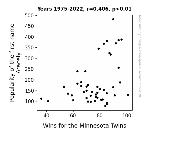 This means 16.4% of the change in the one variable (i.e., Wins for the Minnesota Twins) is predictable based on the change in the other (i.e., Popularity of the first name Aracely) over the 48 years from 1975 through 2022.