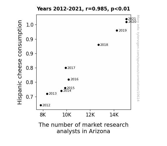 This means 96.9% of the change in the one variable (i.e., The number of market research analysts in Arizona) is predictable based on the change in the other (i.e., Hispanic cheese consumption) over the 10 years from 2012 through 2021.