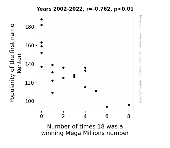 This means 58.1% of the change in the one variable (i.e., Number of times 18 was a winning Mega Millions number) is predictable based on the change in the other (i.e., Popularity of the first name Kenton) over the 21 years from 2002 through 2022.