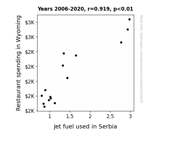 This means 84.5% of the change in the one variable (i.e., Jet fuel used in Serbia) is predictable based on the change in the other (i.e., Restaurant spending in Wyoming) over the 15 years from 2006 through 2020.