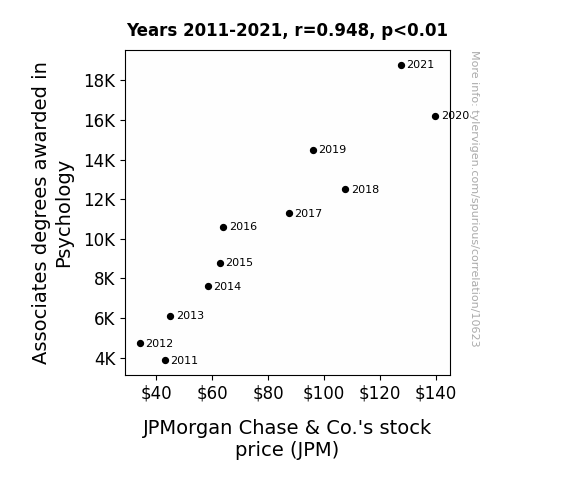 This means 89.9% of the change in the one variable (i.e., JPMorgan Chase & Co.'s stock price (JPM)) is predictable based on the change in the other (i.e., Associates degrees awarded in Psychology) over the 11 years from 2011 through 2021.