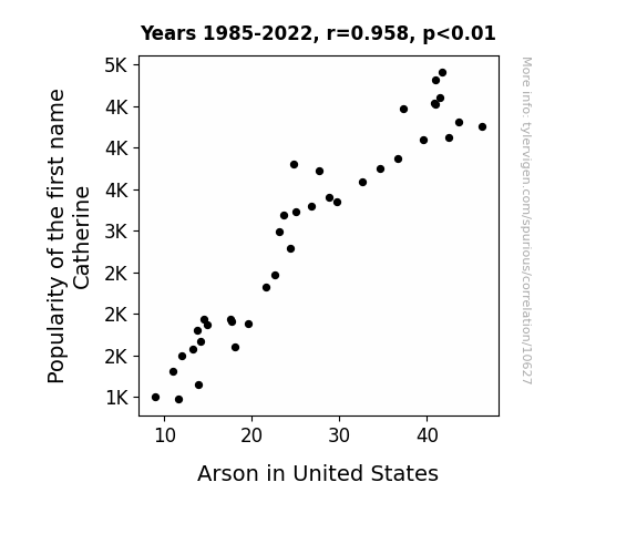 This means 91.7% of the change in the one variable (i.e., Arson in United States) is predictable based on the change in the other (i.e., Popularity of the first name Catherine) over the 38 years from 1985 through 2022.