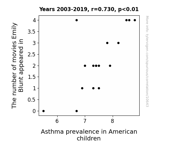 This means 53.3% of the change in the one variable (i.e., Asthma prevalence in American children) is predictable based on the change in the other (i.e., The number of movies Emily Blunt appeared in) over the 17 years from 2003 through 2019.
