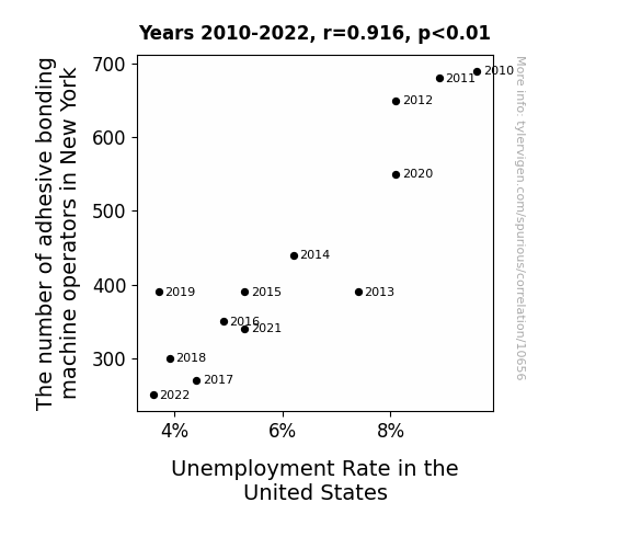 This means 83.8% of the change in the one variable (i.e., Unemployment Rate in the United States) is predictable based on the change in the other (i.e., The number of adhesive bonding machine operators in New York) over the 13 years from 2010 through 2022.