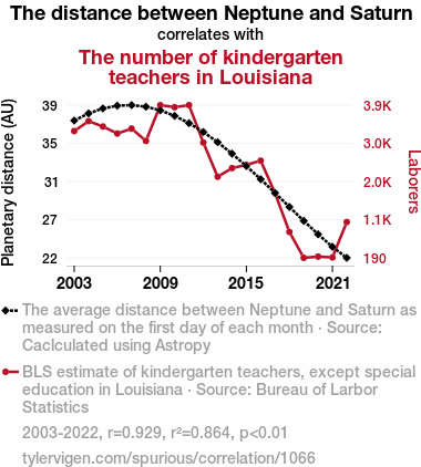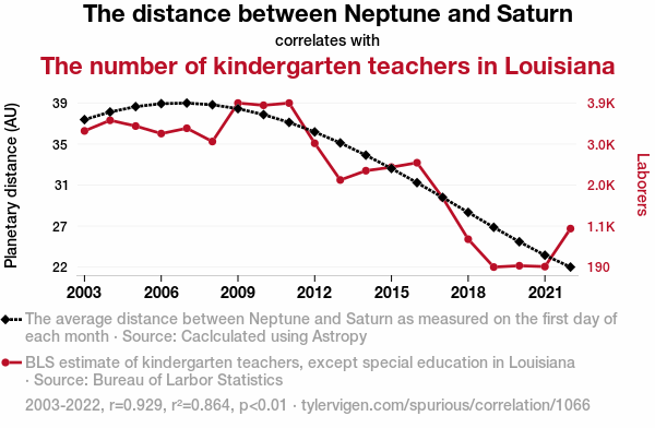 - The spurious research paper: The Cosmic Classroom: Exploring the Correlation Between the Distance from Neptune to Saturn and the Number of Kindergarten Teachers in Louisiana