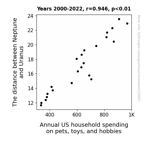 This means 89.5% of the change in the one variable (i.e., Annual US household spending on pets, toys, and hobbies) is predictable based on the change in the other (i.e., The distance between Neptune and Uranus) over the 23 years from 2000 through 2022.