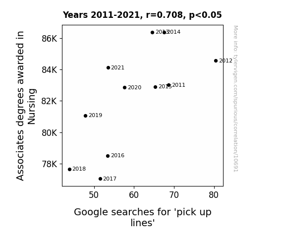 This means 50.1% of the change in the one variable (i.e., Google searches for 'pick up lines') is predictable based on the change in the other (i.e., Associates degrees awarded in Nursing) over the 11 years from 2011 through 2021.