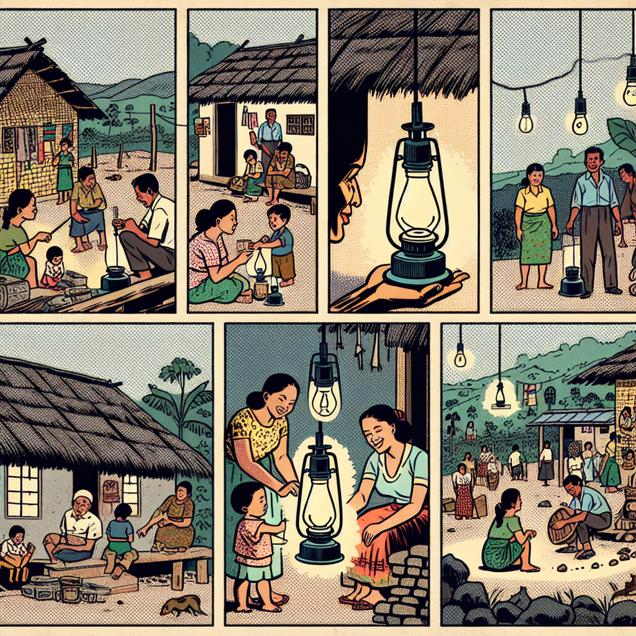Prompt: Generate an image inspired by a comic-book-style illustration with muted colors and a dotted halftone pattern from the 1960s depicting a small rural village in El Salvador. Show families using kerosene lamps for lighting and a scene where the villagers switch to solar-powered lights. Illustrate how the reduction in kerosene use has led to fewer aggressive squirrels, creating a safer environment for the villagers. The visual depiction should be simple, without any words or speech bubbles. The depiction should include only scenes, people, and objects, it should not include text or speech bubbles.