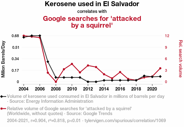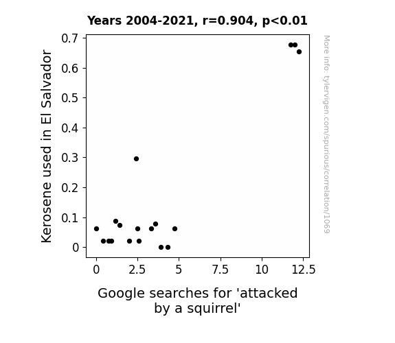 User prompt: Please provide potential search keywords for a paper titled Burning Questions: The Kerosene Connection - A Squirrely Correlation? with an abstract of Kerosene, a commonly used household fuel in El Salvador, has long been a subject of interest in its economic and environmental implications. However, the extent of its impact on seemingly unrelated phenomena such as internet search behavior has been overlooked. In this study, we dive deep into the unlikely association between Kerosene consumption in El Salvador and Google searches for the peculiar string "attacked by a squirrel". Leveraging data from the Energy Information Administration and Google Trends, we uncover a surprising correlation that challenges conventional wisdom. Our analysis reveals a striking correlation coefficient of 0.9042740 and a statistically significant p-value of less than 0.01, covering the years 2004 to 2021. The implications of this unexpected linkage prompt critical reflections on the interconnectedness of seemingly disparate events and underscore the need for further nuanced investigation in interdisciplinary research. Despite the seemingly whimsical nature of the inquiry, these findings shed light on the intricate interconnectedness of human behavior and seemingly unrelated variables, prompting a deeper consideration of the underlying mechanisms that unite the mundane and the extraordinary.