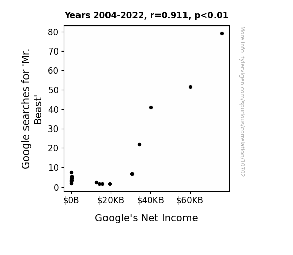 This means 83% of the change in the one variable (i.e., Google's Net Income) is predictable based on the change in the other (i.e., Google searches for 'Mr. Beast') over the 19 years from 2004 through 2022.