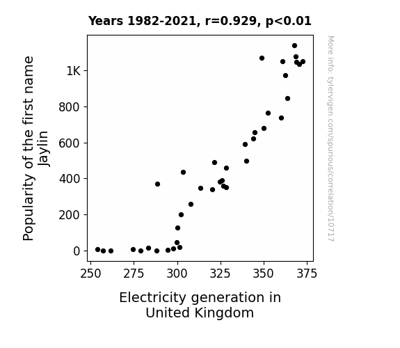 This means 86.4% of the change in the one variable (i.e., Electricity generation in United Kingdom) is predictable based on the change in the other (i.e., Popularity of the first name Jaylin) over the 40 years from 1982 through 2021.