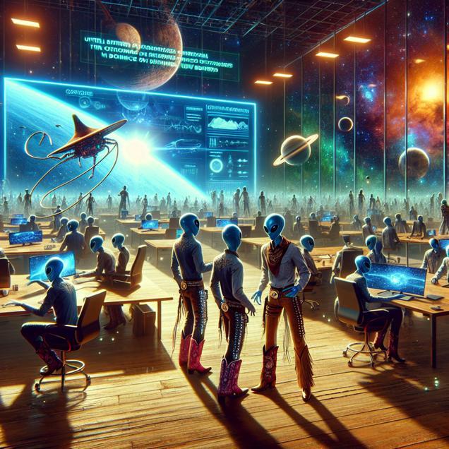 Prompt: An image that looks like it is a scene from 'Star Wars' and depicting this scene: The bustling office from a galaxy far, far away is depicted, with employees excitedly preparing for a big project. In one corner, there are aliens practicing their lassoing skills and intergalactic beings wearing cowboy boots, brainstorming around a holographic map of a distant planetary system. Meanwhile, a giant digital screen displays the statistics of universal searches, with the number of "how to conquer new worlds" searches steadily increasing. This scene is accompanied by a palpable buzz in the air as the employees work feverishly on a top-secret project, the details of which are teased in hushed conversations and speculative whispers. Outside the office, the astral stock ticker prominently displays the trade value of dilithium crystals rising steadily, mirroring the growing anticipation and excitement within the company. The depiction should include only scenes, people, and objects, it should not include text or speech bubbles.