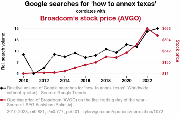 This means 77.7% of the change in the one variable (i.e., Broadcom's stock price (AVGO)) is predictable based on the change in the other (i.e., Google searches for 'how to annex texas') over the 14 years from 2010 through 2023.