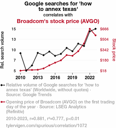 Texas annexation, Google searches, Broadcom stock, stock market analysis, correlation coefficient, market influence, LSEG Analytics, Google Trends, stock price fluctuation