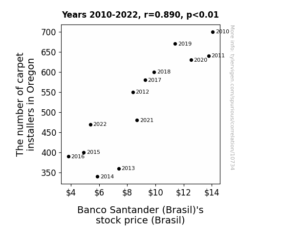 This means 79.3% of the change in the one variable (i.e., Banco Santander (Brasil)'s stock price (Brasil)) is predictable based on the change in the other (i.e., The number of carpet installers in Oregon) over the 13 years from 2010 through 2022.