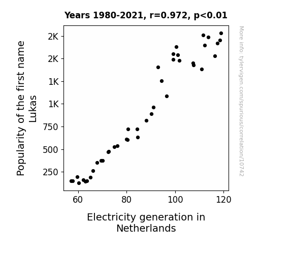 This means 94.6% of the change in the one variable (i.e., Electricity generation in Netherlands) is predictable based on the change in the other (i.e., Popularity of the first name Lukas) over the 42 years from 1980 through 2021.