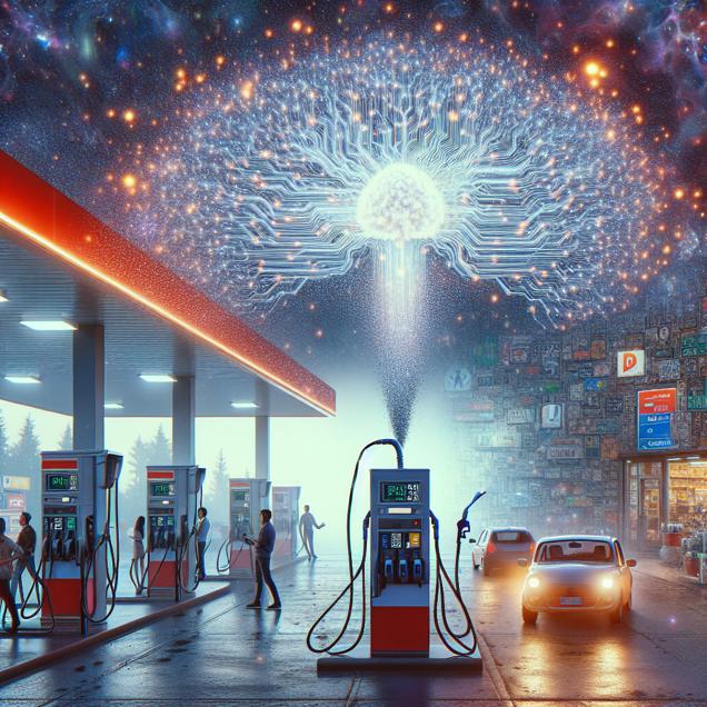 Prompt: Generate a surreal image of an Italian gas station with people filling up their cars. In the background, there is a digital sign displaying the decreasing popularity of the name Tyler in real-time. As fewer and fewer babies are named Tyler, tiny sparks of gasoline are seen evaporating into thin air, leaving behind a faint shimmer. The gas pump counters begin to slow down, showing a decrease in the amount of gasoline being pumped. It's as if the flow of gasoline in the station is directly tied to the frequency of the name Tyler being chosen for babies. The depiction should include only scenes, people, and objects, it should not include text or speech bubbles.