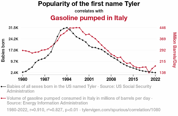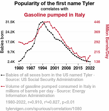 - The spurious research paper: The Pump Factor: Exploring the Tyler-Fueled Relationship Between Name Popularity and Gasoline Consumption in Italy