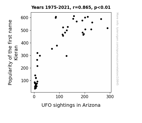 This means 74.8% of the change in the one variable (i.e., UFO sightings in Arizona) is predictable based on the change in the other (i.e., Popularity of the first name Kieran) over the 47 years from 1975 through 2021.